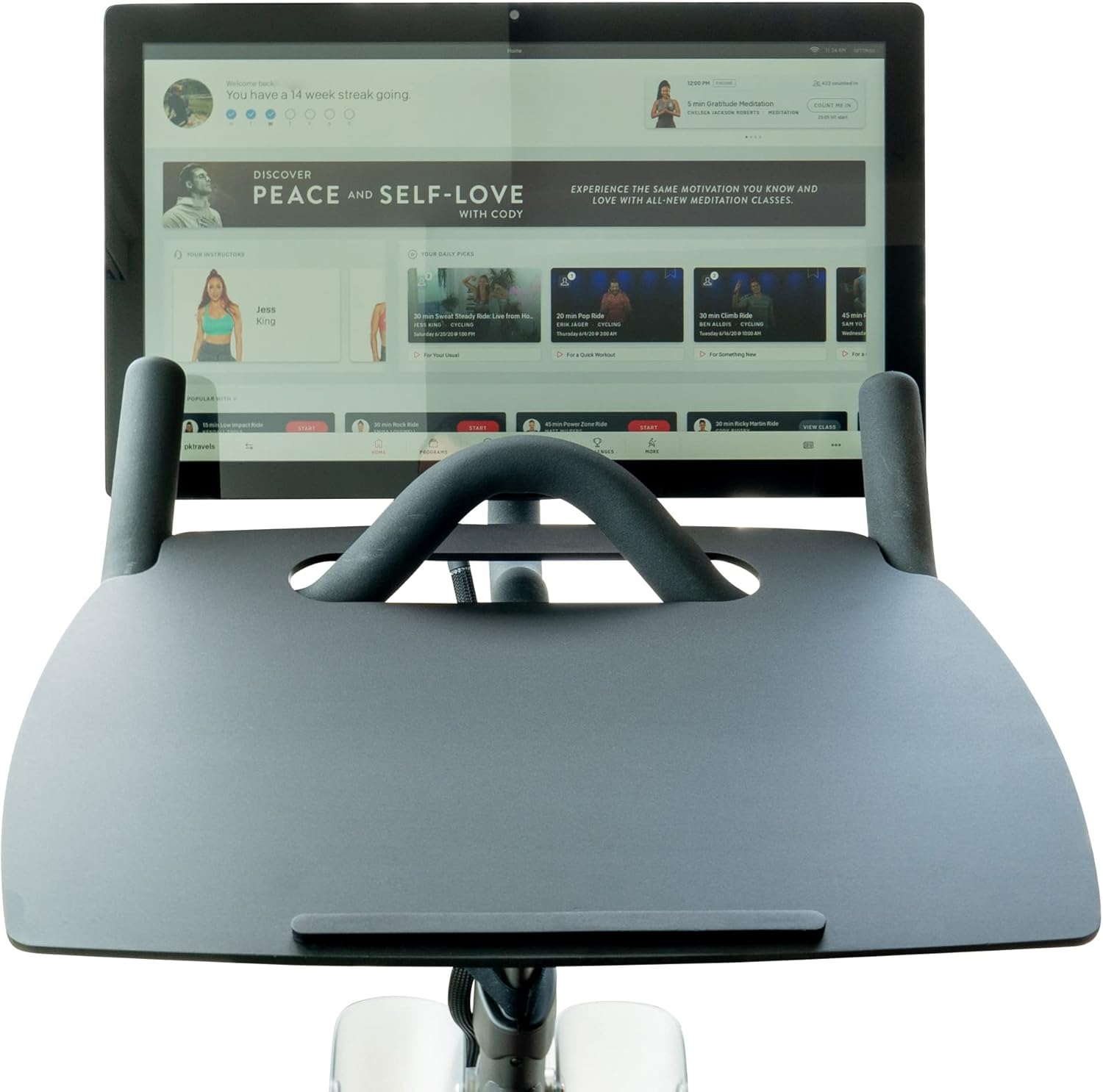 - WORK FROM HOME - Turn your Peloton into the workstation of your dreams. Have a boring meeting or training to knock out? How about you get a 30-minute ride in to keep things interesting.